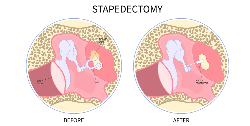 Treatment primarily involves surgical intervention when hearing aids are insufficient. In laser stapedotomy, the surgeon uses a precision laser to create a small hole in the fixed stapes footplate. A prosthesis is then inserted to connect the incus bone to the inner ear, allowing sound vibrations to be transmitted effectively. The laser minimizes trauma to surrounding tissues, reduces operative bleeding, and provides high accuracy. The procedure is usually performed under local or general anesthesia and has a high success rate in restoring hearing. Postoperative recovery is generally quick, with patients advised to avoid sudden pressure changes, heavy lifting, or water entry into the ear until healing is complete.